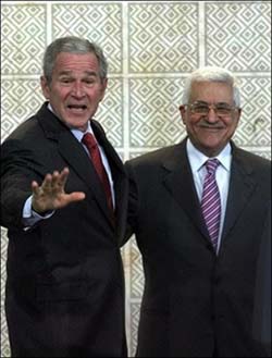 阿巴斯贊揚(yáng)布什是第一個(gè)愿意承諾全力支持巴勒斯坦建國(guó)的美國(guó)總統(tǒng),并給予了紅地毯歡迎。