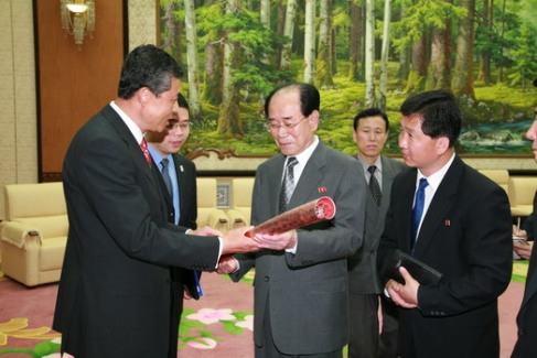 中新網(wǎng)5月6日電 中國駐朝鮮大使館網(wǎng)站消息,5月5日,朝鮮最高人民會議常任委員會委員長金永南受朝鮮勞動(dòng)黨總書記金正日的委托,在萬壽臺議事堂會見了中國駐朝鮮大使劉曉明。劉大使請金永南委員長轉(zhuǎn)達(dá)中共中央總書記、國家主席胡錦濤致金正日總書記的口信和親切問候。金永南委員長表示感謝并允轉(zhuǎn)達(dá),同時(shí)也請劉大使轉(zhuǎn)達(dá)金正日總書記對胡錦濤總書記的親切問候。