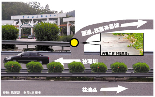 昨日記者來到事發(fā)現(xiàn)場,幾位揭陽市公安局交警支隊惠來高速公路大隊的民警正在現(xiàn)場做警戒。警戒線圍起的事發(fā)地點,就位于深汕高速進入服務區(qū)路口不遠處。這個路口可以通往惠來縣城,也可通往惠來高速公路大隊。