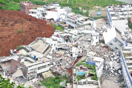 然而集鎮(zhèn)背后,高聳的大山被生生拉了一條“傷痕”——灰色的土石從山腰傾瀉而下,一直拉到集鎮(zhèn)的邊緣。土石經(jīng)過的地方,所有的民房都被埋了進去。集鎮(zhèn)上靠近山坡的房屋,也有許多未能幸免;虮宦瘛⒒虻顾、或傾斜,剛剛建起的新房成了廢墟。經(jīng)歷過“5·12”特大地震的當?shù)厝苏f,這些房屋的樣子和地震沒什么兩樣。