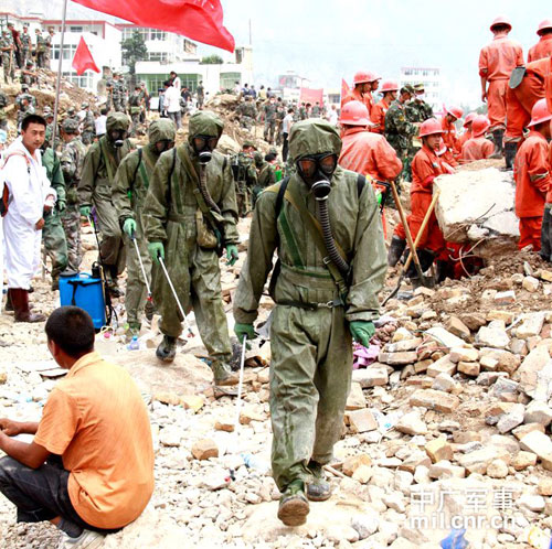 記者在現(xiàn)場看到,蘭州軍區(qū)某集團軍防化團官兵對每名挖出來的遇難群眾遺體進行認真細致的消毒、殺菌。核生化應(yīng)急救援分隊的官兵身著密不透風(fēng)的連體橡膠防護服,攜帶手持消毒機對救災(zāi)現(xiàn)場實施噴灑作業(yè),每走幾步,都會大汗淋漓。防化團團長蒲軍禮告訴記者,現(xiàn)在防疫形勢仍然很嚴(yán)峻,因為遇難者遺體挖掘出來后,氣味很大,消毒必須嚴(yán)密組織。為了保障救災(zāi)工作順利進行,部隊規(guī)定,只要在災(zāi)區(qū)作業(yè),帶手套、帶口罩、穿長袖要作為一項紀(jì)律嚴(yán)格執(zhí)行。