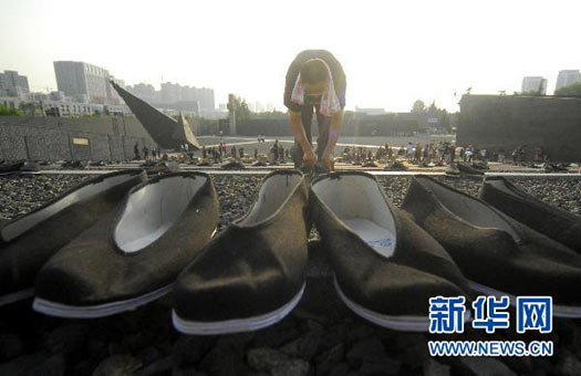 為了紀念二戰(zhàn)期間在日本遇害的6830名被強擄的中國勞工,14日下午,被擄勞工中的幸存者及遇難者家屬、日本友人等近50人在南京舉行了6830雙布鞋擺放活動。
