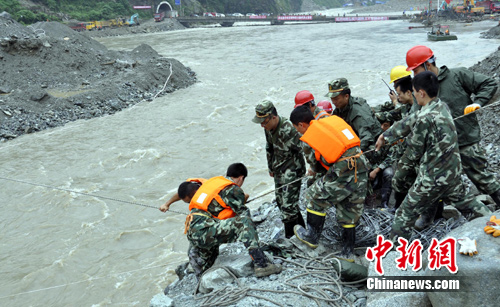 中新網(wǎng)映秀8月18日電(郭永全 張浪 鄢銀嬋)18日早6點(diǎn),汶川消防大隊(duì)映秀消防站接到武警水電部隊(duì)求助電話,在位于映秀鎮(zhèn)堰塞湖處處理淤泥沙石拓寬河道的數(shù)十名機(jī)械工人因河道加寬,水流湍急,無法從原來搭設(shè)的繩橋往返對(duì)岸進(jìn)行作業(yè)。