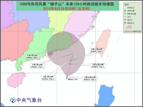 中新網(wǎng)8月29日電 據(jù)中央氣象臺網(wǎng)站消息,中央氣象臺于8月29日10時繼續(xù)發(fā)布臺風藍色預警,2010年第6號熱帶風暴“獅子山”的中心將以每小時5至10公里的速度向偏北方向移動,強度逐漸加強,并向廣東東部到福建南部沿?拷。29日中午到30日中午,南海北部、廣東東部沿海、福建南部沿海將有6至7級大風。