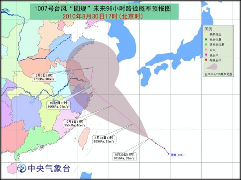 預(yù)計(jì),“圓規(guī)” 將以每小時(shí)15公里左右的速度向西北方向移動(dòng),強(qiáng)度還將繼續(xù)加強(qiáng),將于9月1日白天進(jìn)入東海南部海面,以后逐漸向浙江中部到江蘇中部一帶沿?拷30日晚上至31日白天,“圓規(guī)”對我國近海無影響。