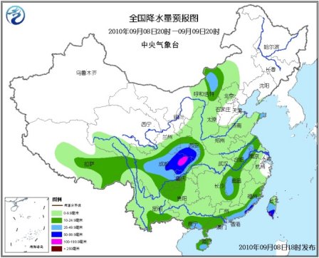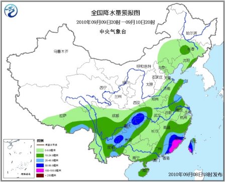 8日20時至9日20時,西藏中東部、青海南部、甘肅南部、寧夏南部、陜西、內(nèi)蒙古中部、華北大部、黃淮、江淮、江漢、江南大部、華南以及西南地區(qū)等地有小到中雨或陣雨,其中,四川盆地、川西高原中部、甘肅東南部、陜西南部、重慶西部和北部、福建東南部沿海、廣東中東部沿海、臺灣中南部等地有大雨或暴雨,四川盆地東北部局地有大暴雨;內(nèi)蒙古中部、山東半島東部、蘇皖中部、江西西部、廣西東南部、海南南部等地的部分地區(qū)有大雨;上述局部地區(qū)并伴有短時雷雨大風(fēng)或冰雹等強對流天氣。新疆北部、甘肅西部、內(nèi)蒙古中西部和東南部等地有4~6級風(fēng)。受10號熱帶風(fēng)暴影響,臺灣海峽、臺灣以東洋面和以南海域、南海東北部有7~9級大風(fēng),風(fēng)暴中心經(jīng)過的附近海域風(fēng)力有10級,陣風(fēng)11~12級;東海南部有5~7級東南風(fēng)。黃海中北部有5~6級旋轉(zhuǎn)風(fēng);南海中部有5~6級西南風(fēng)。