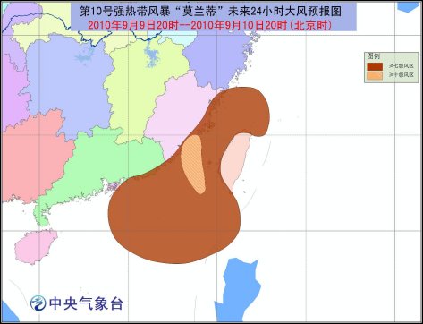 受熱帶風(fēng)暴和西南季風(fēng)共同影響,9月9日20時到10日20時,巴士海峽、巴林塘海峽、臺灣海峽、南海北部、臺灣西部和南部沿海、福建中南部沿海、廣東沿海將有7-8級大風(fēng),“莫蘭蒂”中心經(jīng)過的附近海面或地區(qū)的風(fēng)力有9-11級,陣風(fēng)可達12-13級;浙江東部沿海和南部、福建、廣東中東部和西南部、廣西南部、海南、臺灣等地有大雨或暴雨,其中,福建東南部、臺灣南部等地局部有大暴雨。