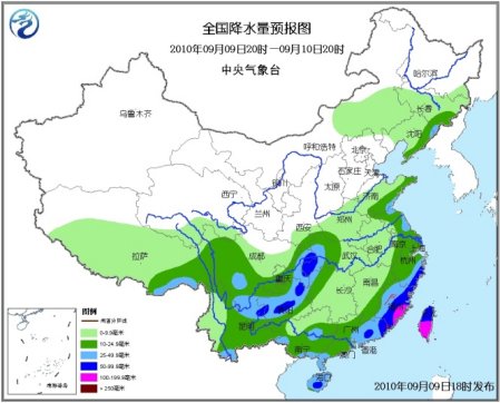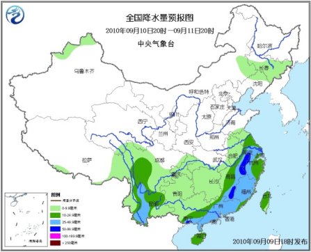 9日20時(shí)至10日20時(shí),青海東南部、西藏大部、陜西東南部、內(nèi)蒙古東南部、吉林、遼寧、黃淮、江淮、江漢、江南、華南、西南地區(qū)大部等地有小到中雨或陣雨,其中,川西高原南部、重慶東部、湖北西南部、貴州中北部和西部、云南東北部、浙江東部沿海和南部、福建、廣東中東部和西南部、廣西南部、海南、臺(tái)灣等地有大雨或暴雨,福建東南部、臺(tái)灣南部等地局部有大暴雨;另外,西藏東南部、江蘇東北部等地的部分地區(qū)有大雨;上述部分地區(qū)并伴有短時(shí)雷雨大風(fēng)等強(qiáng)對(duì)流天氣。新疆西北部、內(nèi)蒙古中西部和東南部有4~5級(jí)風(fēng);廣東沿海、福建沿海、浙江南部沿海等地有6~8級(jí)風(fēng)。受“莫蘭蒂”的影響,臺(tái)灣海峽、臺(tái)灣以東洋面和以南海域、南海北部有7~8級(jí)大風(fēng),“莫蘭蒂”中心經(jīng)過的附近海域風(fēng)力有9~11級(jí),陣風(fēng)可達(dá)12~13級(jí);東海南部有5~7級(jí)東南風(fēng)。