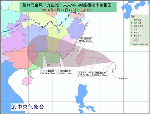 據(jù)中央氣象臺預計,受“凡亞比”影響,中國東南海區(qū)將有狂風。17日至21日,受其影響,臺灣以東洋面、東海南部、巴士海峽、巴林塘海峽、臺灣海峽、臺灣省及其沿海、福建東部及沿海、浙江東南部沿海、廣東東部沿海的風力將逐漸加大到7~9級,部分海域或地區(qū)的風力可達10~12級,“凡比亞”中心經(jīng)過的附近海面或地區(qū)的風力有13~16級。