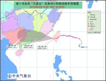 今年第11號強臺風“凡亞比”于19日14時在中國臺灣省臺南縣楠西鄉(xiāng)境內(nèi)減弱為臺風,17時臺風中心位于臺南縣七股鄉(xiāng)境內(nèi),就是北緯23.1度、東經(jīng)120.1度,中心附近最大風力有12級(35米/秒),中心最低氣壓為965百帕。