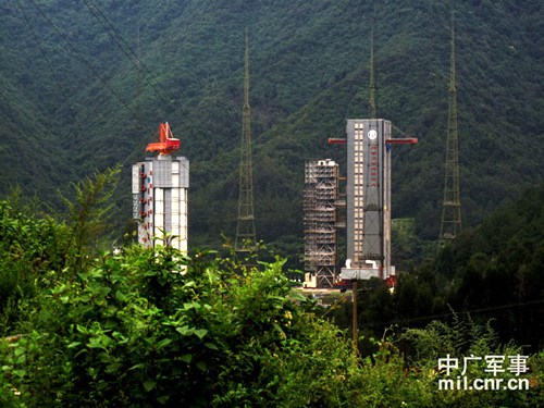 車行一個小時左右,我們終于到達(dá)了向往已久的西昌衛(wèi)星發(fā)射中心。由于事先沒有經(jīng)過有關(guān)部門批準(zhǔn),此次我們不能進(jìn)入發(fā)射中心核心區(qū)域進(jìn)行采訪,只能乘車沿著窄窄的彎曲山路,圍繞著群山環(huán)抱下的發(fā)射場,也就是2號發(fā)射平臺和整裝待發(fā)的“嫦娥二號”遠(yuǎn)遠(yuǎn)地參觀一下。但即使這樣,我們還是能夠清晰地看到2號、3號固定發(fā)射塔和總裝廠房,呈三角形巍然屹立于山谷中。