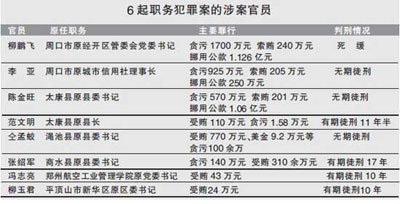10月26日上午,省高院首次集中通報(bào)了近期宣判的6起在全省有重大影響的職務(wù)犯罪案。涉案的8個(gè)被告人中,有3個(gè)縣委書(shū)記,一個(gè)縣長(zhǎng),兩個(gè)區(qū)委書(shū)記,一個(gè)信用社理事長(zhǎng),一個(gè)高校黨委書(shū)記。涉案金額最高的上億元,最少的24萬(wàn)元。其中3個(gè)人被判處無(wú)期徒刑和死緩。