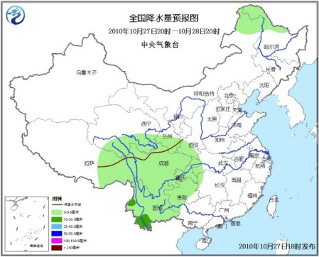 中新網(wǎng)10月27日電 據(jù)中央氣象臺(tái)預(yù)報(bào),未來(lái)三天,新疆西部山區(qū)和北部、西藏東部、青海南部、甘肅南部、川西高原北部、內(nèi)蒙古東北部、黑龍江北部等地有小雨(雪)或雨夾雪。陜西南部、西南地區(qū)大部、湖北西南部、湖南西北部等地有小到中雨。