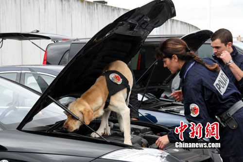 胡主席來(lái)訪,法國(guó)進(jìn)行嚴(yán)密安保。圖為一女警攜警犬在檢查車輛。