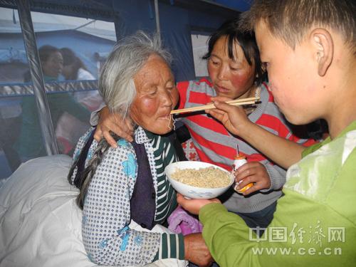 在定西“7·22”地震中,岷縣梅川鎮(zhèn)永光村70多歲的李改花老婆婆一家5口有4人遇難,年僅10歲的外孫子后智斌一夜間變成了“小大人”。他說自己要好好孝敬外婆,讓外婆以后的日子過得幸?鞓。圖為小后智斌在抗震棚里給外婆喂飯。(記者 黃俊毅 攝)