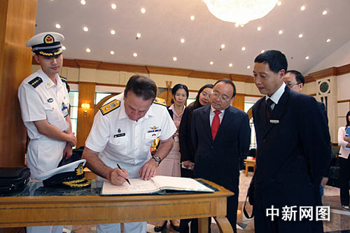 在題詞本上,大衛(wèi)•安森準(zhǔn)將寫下了“感謝你們對新西蘭皇家海軍的盛情款待,致以最良好的祝愿”的句子。最后,雙方還互贈了禮物以作紀(jì)念。