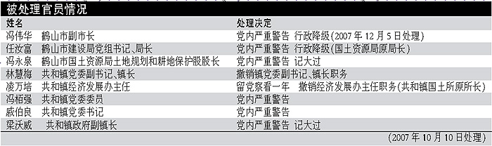 據監(jiān)察部、國土資源部12月11日發(fā)布的通報,鶴山市通過偽造虛假材料和化整為零的辦法,擅自調整規(guī)劃、違法補辦手續(xù),違規(guī)批準該市共和鎮(zhèn)3626.8畝土地用于工業(yè)開發(fā),受到監(jiān)察部、國土資源部專案調查組的嚴厲批評。記者采訪了解到,江門市紀委、監(jiān)察局已經對鶴山市副市長馮偉華給予嚴重黨內警告、行政降級處分,給予國土局原局長任汝富黨內嚴重警告、行政降級處分。