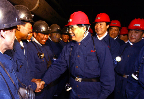 胡錦濤換上工作服,穿上雨靴,帶上礦燈,乘坐井下專用車,通過8公里長的巷道,來到400多米深的礦井采掘區(qū)。他走到正在緊張作業(yè)的礦工們中間,同大家親切握手。礦井里的氣氛頓時熱烈起來。