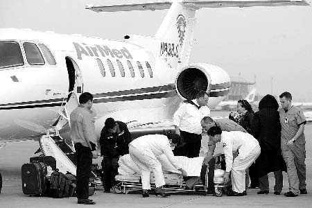 在新鄭國(guó)際機(jī)場(chǎng)的停機(jī)坪內(nèi),記者看到一架紅白相間的小型噴氣式飛機(jī),機(jī)身上紅色十字的救護(hù)標(biāo)志十分醒目,飛機(jī)降落后,飛機(jī)內(nèi)的外籍機(jī)務(wù)人員和護(hù)士用專用的醫(yī)用擔(dān)架,將正在熟睡中的鄭麗抬下飛機(jī),送上機(jī)場(chǎng)的120急救車,然后送往鄭州市內(nèi)一家醫(yī)院,整個(gè)過程用了半個(gè)小時(shí)。