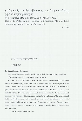 這是第十四世達(dá)賴?yán)餅閾碜o(hù)協(xié)議事致毛澤東主席的電報(bào)。