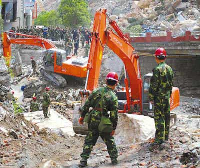 5月15日,記者看到,中國(guó)人民解放軍第二炮兵及北京路橋、四川路橋和華西集團(tuán)的挖掘機(jī)、推土機(jī)等重型施工機(jī)械經(jīng)過(guò)長(zhǎng)途開進(jìn),突入北川,立即投入,晝夜不停。四臺(tái)挖掘機(jī)在探照燈照射下,緊張施工,機(jī)械手輪流操作,機(jī)器徹夜不停轉(zhuǎn)。