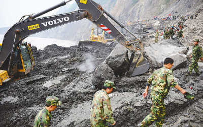 16日晚間,在2號塌方處,一輛大型推土機差點被滾落的山石推到下面的河里去。1/3的車體都懸在外面,車身傾斜角度達到45度,大家都驚出了一身冷汗。奮勇作戰(zhàn)15個小時后,17日中午,該處的5000方土石才被完全清理。