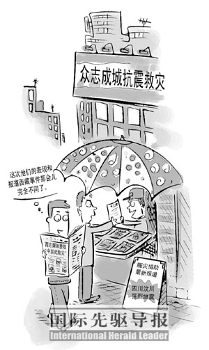 國際先驅導報文章 中國發(fā)生“5·12”汶川大地震之后,西方媒體給予了大量積極正面的報道。一直以來認為“中國媒體不可信”的西方媒體,比如CNN、BBC等,在此次地震報道中都大量使用了中國媒體的電視畫面和文字報道,這十分少見。與之前報道西藏“3·14事件”、“奧運圣火傳遞”相比,西方媒體報道的態(tài)度來了個180度的大轉彎。即使有少量負面報道和批評聲音,但這些已經(jīng)讓西方讀者覺得不那么可信了。西方民眾、媒體評論人,總體上都正面評價中國政府組織的抗震救災,以及贊揚中國人民在災難面前表現(xiàn)出來的勇氣。