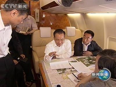 下午5時(shí)13分許,一下飛機(jī),溫家寶就改乘直升機(jī)前往北川縣的唐家山堰塞湖從空中察看有關(guān)情況。