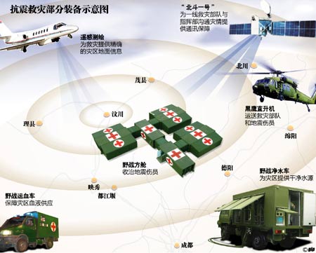 “北斗一號(hào)”、航測(cè)飛機(jī)、野戰(zhàn)醫(yī)療方艙、野戰(zhàn)運(yùn)血車……這些帶有硝煙味道的軍事名詞,在連日來的四川抗震救災(zāi)中大顯身手,發(fā)揮了不可替代的作用。