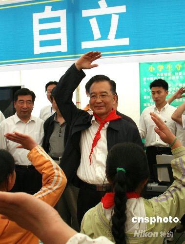 溫家寶總理和孩子們一起敬隊(duì)禮。中新社發(fā) 齊彬 攝