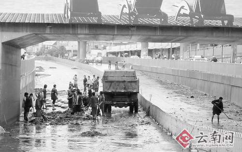 市排水公司工作人員在清除淤泥(楊崢/攝)