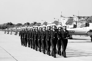 愛(ài)美是女人的天性,姑娘們?cè)谟?xùn)練場(chǎng)上不怕流血流汗,就怕委屈了嬌嫩的皮膚。為了抵抗紫外線(xiàn)照射,每天進(jìn)場(chǎng)前,無(wú)論多忙,她們也忘不了往臉上涂一層厚厚的防曬霜。隨著戶(hù)外訓(xùn)練時(shí)間增加,防曬霜依舊擋不住紫外線(xiàn)照射。不到一個(gè)月,白嫩的膚色由白變紅、由紅變黑,有的甚至暴皮。起初,從外場(chǎng)歸來(lái),姑娘們總愛(ài)對(duì)著鏡子,把一張臉由遠(yuǎn)及近、從左到右照個(gè)遍。后來(lái),每看見(jiàn)自己日漸“成熟”的臉,免不了聲聲惋惜和流下行行熱淚。再后來(lái),她們索性扔掉防曬霜,甘愿接受烈日的“饋贈(zèng)”。如今,她們戴上飛行帽,外不露一絲秀發(fā),顯得更加颯爽俊美。