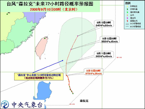 今年第13號臺風(fēng)“森拉克”(SINLAKU)今天5時(shí)位于中國臺灣省恒春市東南方向大約490公里的洋面上,也就是北緯19.5度,東經(jīng)124.7度,中心附近最大風(fēng)力有12級(35米/秒)。預(yù)計(jì),“森拉克”將以每小時(shí)10公里左右的速度緩慢向偏北方向移動(dòng),強(qiáng)度繼續(xù)加強(qiáng)。