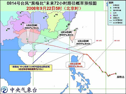 中新網(wǎng)9月22日電 據(jù)問天網(wǎng)消息,中央氣象臺今天早晨六時發(fā)布臺風(fēng)消息:今年第14號臺風(fēng)“黑格比”(HAGUPIT)的中心今天早晨5時其位于我國臺灣省恒春市東南方大約490公里的西北太平洋洋面上,就是北緯18.9度,東經(jīng)124.0度,中心附近最大風(fēng)力有13級(38米/秒)。
