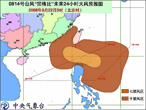 受“黑格比”的影響,今天白天到夜間,臺灣以東洋面、臺灣東南部沿海、臺灣海峽、福建中南部沿海、廣東東部沿海的風(fēng)力將逐漸加大到6-8級,巴士海峽、巴林塘海峽、南海東北部海面的風(fēng)力可達(dá)8-10級,“黑格比”中心經(jīng)過的附近海面的風(fēng)力可達(dá)11-14級。