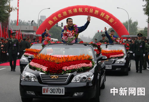 神舟七號飛船航天員翟志剛、劉伯明、景海鵬29日乘專機(jī)抵達(dá)北京后,當(dāng)日回到北京航天城,受到民眾的夾道歡迎。中新社記者 齊彬 攝