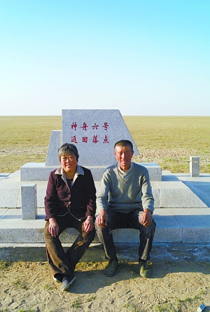 昨日,牧民賈四娃(右)夫婦坐在神六落地紀念碑前留影。