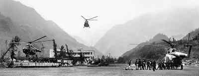 直升機(jī)在深山峽谷間執(zhí)行抗震救災(zāi)任務(wù)。