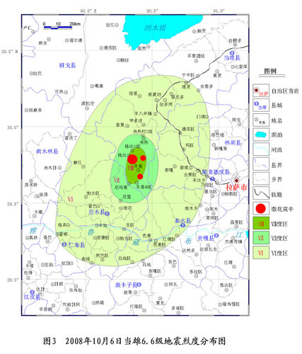 2008年10月6日16時30分(北京時間),西藏自治區(qū)拉薩市當雄縣(北緯29.8°,東經(jīng)90.4°)發(fā)生Ms6.6級地震。地震發(fā)生后,由中國地震局、西藏自治區(qū)地震局和云南省地震局及西藏自治區(qū)相關單位組成的聯(lián)合地震現(xiàn)場工作隊在震區(qū)開展了為期7天的地震災害調查和損失評估工作,共計行程20000多公里,完成60個居民點和3個地震地質災害點的調查工作,其中抽樣調查點41個。在震區(qū)各級黨委、政府的協(xié)同配合下完成了地震災害損失評估工作。