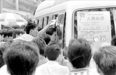 集中銷售彩票的模式開展起來。當時,福彩、體彩的人拉著電視機、洗衣機、自行車等,到農(nóng)村的集市或者城市的廣場上售賣。人們管這種彩票叫“刮獎”,買到后,只需用指甲刮開,便知道自己是中了自行車、洗衣機,還是一無所獲。