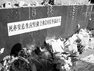 “死亦安息生應(yīng)堅(jiān)強(qiáng)讓我們共同祈福法大”。10月31日中午,中國政法大學(xué)昌平校區(qū)拓荒牛雕塑的基座上,一條白底黑字的條幅在陽光下冷冷地注視著過往的每一個(gè)人。雕塑前的地面上,幾排黃色的、白色的菊花在秋風(fēng)中靜靜綻放。