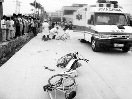 而此時(shí),駱某正駕駛著泥頭車(chē)(當(dāng)?shù)乩恋囊环N貨車(chē))經(jīng)城東歧江路開(kāi)往城東中學(xué),在歧江路的拐彎處撞倒了3名學(xué)生和1名群眾。正在城東中學(xué)北門(mén)(后門(mén))值班的綜治員黃積強(qiáng)和張耀毫發(fā)現(xiàn)后,一人邊大喊讓剛放學(xué)的學(xué)生們躲避,邊用對(duì)講機(jī)向白蕉鎮(zhèn)派出所報(bào)告,另一人則追趕泥頭車(chē)喝令其停下。