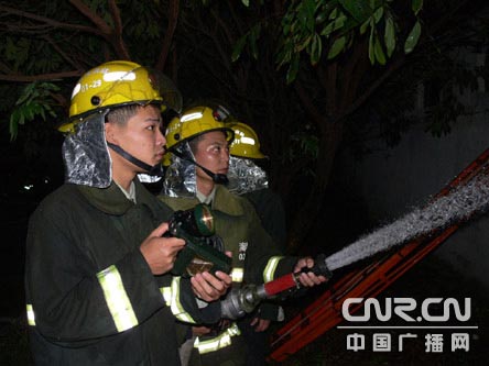 根據(jù)現(xiàn)場(chǎng)情況,中隊(duì)指揮員立即向支隊(duì)“119”調(diào)度指揮中心請(qǐng)求增援,并果斷下達(dá)作戰(zhàn)命令,一臺(tái)消防車(chē)?吭谥评滠(chē)間的圍墻外,鋪設(shè)水帶出兩支水槍向制冷車(chē)間射水控制火勢(shì),另一臺(tái)消防駛?cè)霃S區(qū)大門(mén)口內(nèi)部,?吭谀媳苯,消防官兵身穿防化服,佩戴空氣器在工廠技術(shù)人員的帶領(lǐng)下深入制冷車(chē)間門(mén)口進(jìn)行滅火和稀釋泄漏的氨氣。另兩臺(tái)消防車(chē)負(fù)責(zé)供水,并進(jìn)行現(xiàn)場(chǎng)的疏散和警戒。