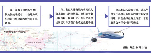 第三利益人自然就是旅行社。據了解,近幾年來專門從事公務出國的旅行社發(fā)展迅速,目前全國已有上百家,集中在廣州、上海、北京、南京、寧波等地。它們靠為公務團安排行程賺錢!艾F在各級各地組織的出境、出國考察活動,絕大部分是通過旅游公司出去、并由境外旅游機構接團安排行程的,其實就是公款旅游!毙掠嗍形晃桓刹繉τ浾哒f。