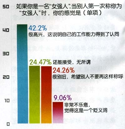 那么,女性又如何看待“女強(qiáng)人”這個(gè)稱呼呢?調(diào)查結(jié)果顯示,只有42.2%的受調(diào)查者選擇“很高興,這說(shuō)明自己的工作能力得到了認(rèn)同”,24.47%的受調(diào)查者選擇“還能接受,無(wú)所謂”。由此可見(jiàn),表示能夠接受“女強(qiáng)人”稱呼的占受調(diào)查者的六成!芭畯(qiáng)人”稱呼對(duì)許多女性而言已經(jīng)不再是一個(gè)心結(jié)。