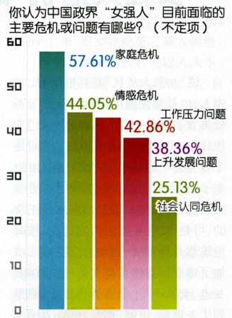 57.61%的受調(diào)查者認(rèn)為,政界“女強(qiáng)人”面臨的主要危機(jī)是“家庭危機(jī)”
