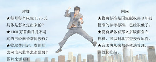 音著協(xié)云南辦事處負(fù)責(zé)人張晏琿針?shù)h相對(duì)地表示,“收費(fèi)不是目的,保護(hù)知識(shí)產(chǎn)權(quán)才是目的,有‘抱團(tuán)’抵制現(xiàn)象也是對(duì)知識(shí)產(chǎn)權(quán)有進(jìn)一步認(rèn)識(shí)的表現(xiàn)。雖然尊重其選擇,但是這種行為并非理性明智之舉”。