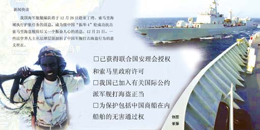 中央軍委法制局有關(guān)負(fù)責(zé)人在接受媒體采訪時(shí)說,中國軍艦赴亞丁灣、索馬里海域?qū)嵤┳o(hù)航的行動(dòng),是根據(jù)聯(lián)合國安理會(huì)決議作出的決定,完全符合有關(guān)國際法的規(guī)定。