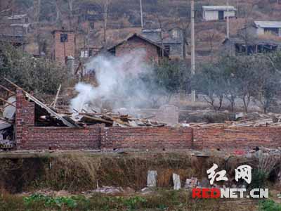 冷水江市巖口鎮(zhèn)農(nóng)科村一鞭炮廠倉庫被炸為廢墟。