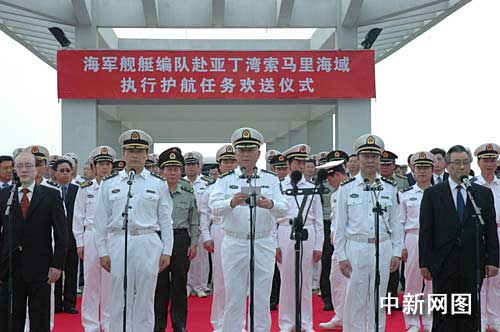 中新網(wǎng)12月26日電 由“?凇碧、“武漢”號和“微山湖”號綜合補(bǔ)給艦組成的中國海軍艦艇編隊(duì)今天下午13時(shí)45分宣布從三亞啟航,赴亞丁灣、索馬里海域執(zhí)行護(hù)航任務(wù)。中央軍委委員、海軍司令員吳勝利在歡送儀式上說,海軍艦艇編隊(duì)執(zhí)行此次護(hù)航任務(wù),是中國首次使用軍事力量赴海外維護(hù)國家戰(zhàn)略利益。